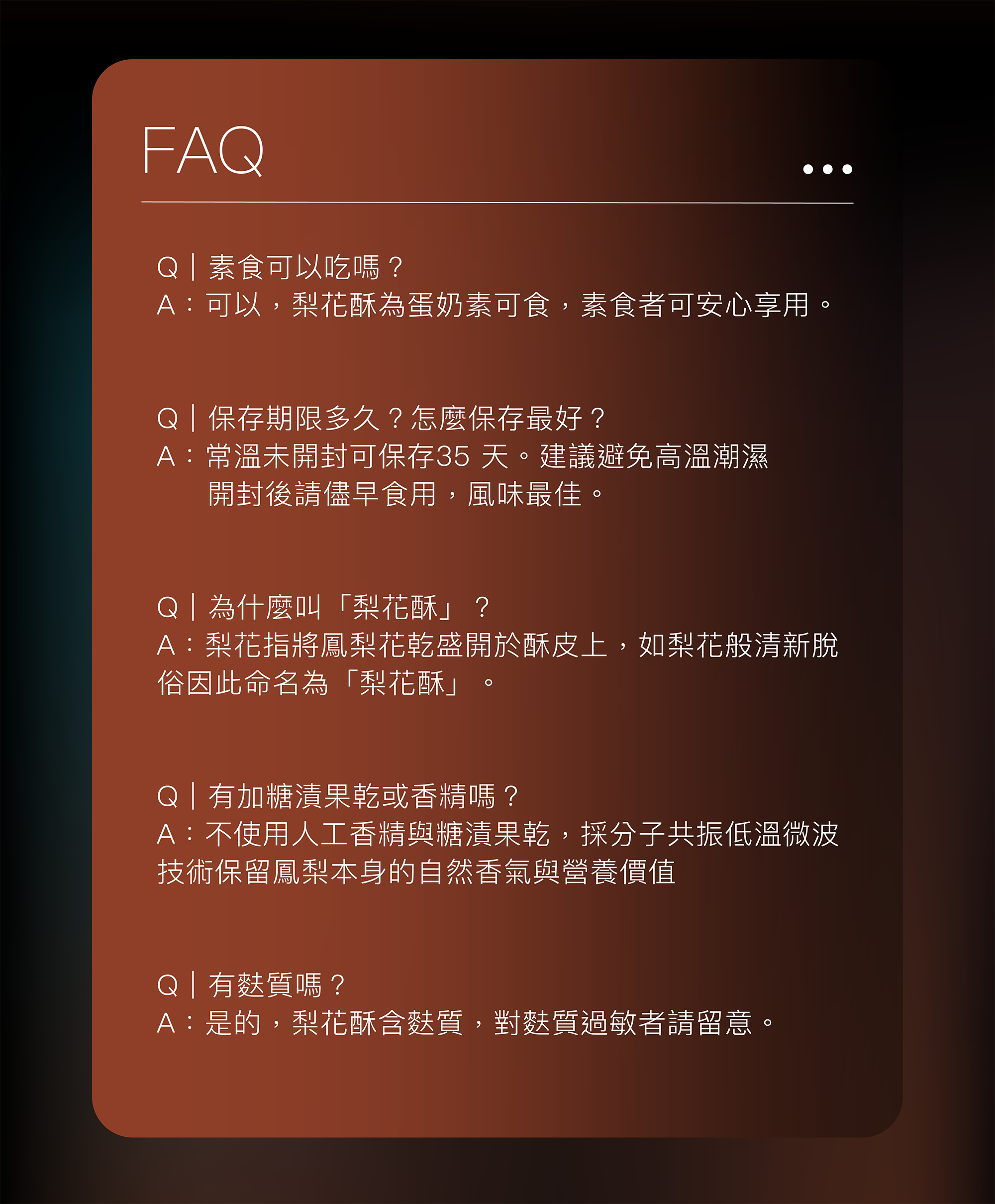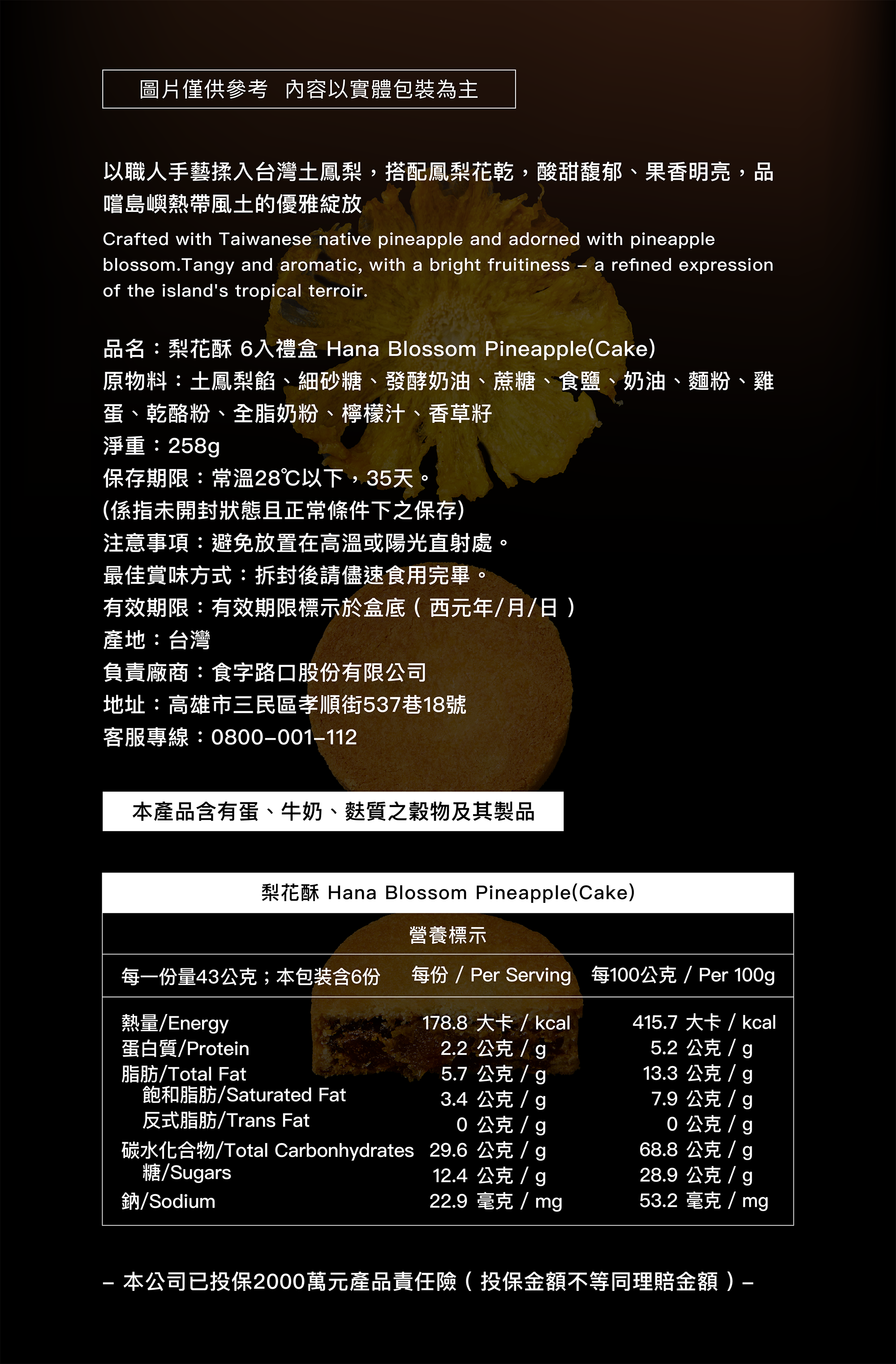 原物料 | 土鳳梨餡、砂糖、發酵奶油、蔗糖、鹽、奶油、麵粉、雞蛋、乾酪粉、奶粉、檸檬汁、香草籽