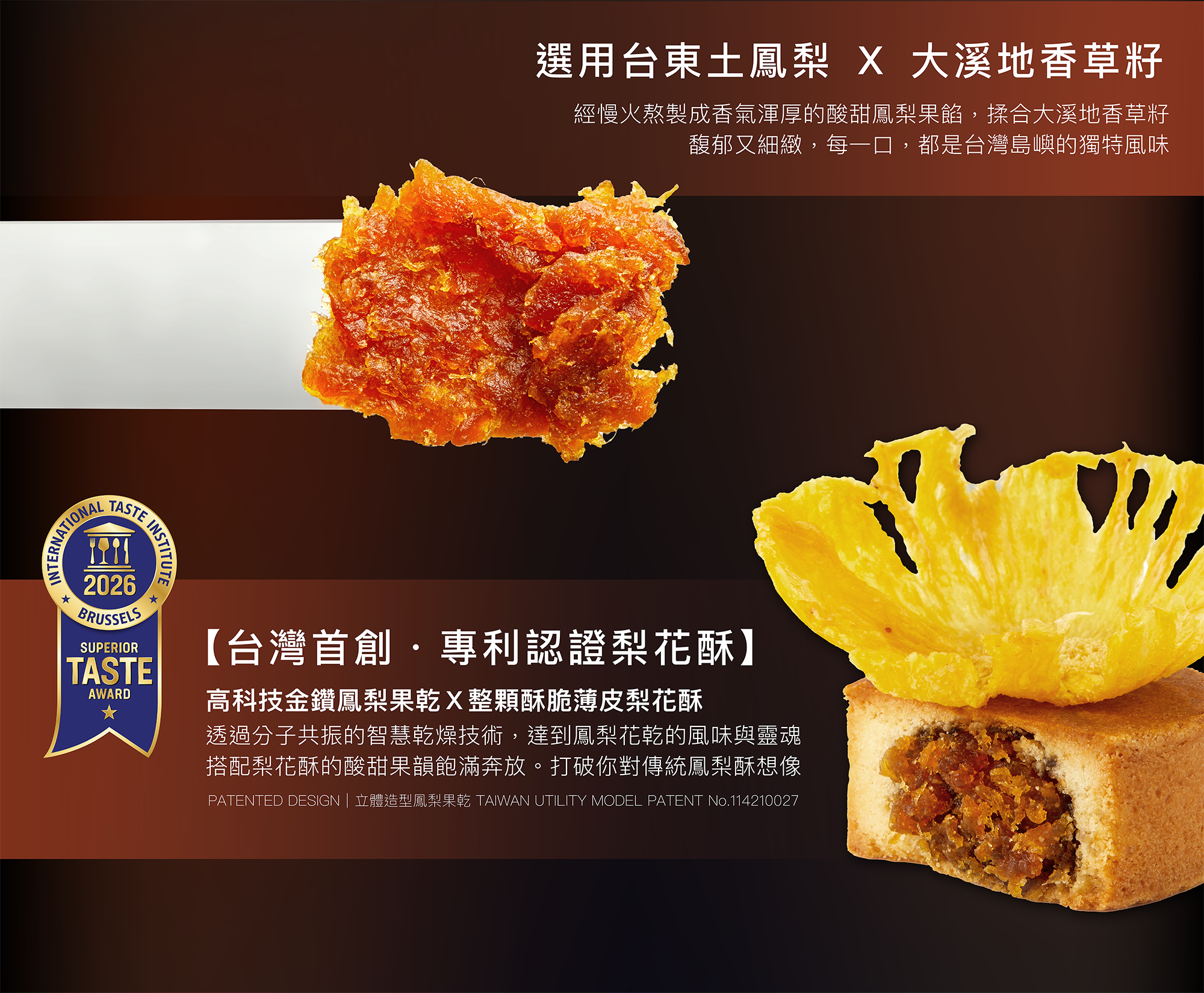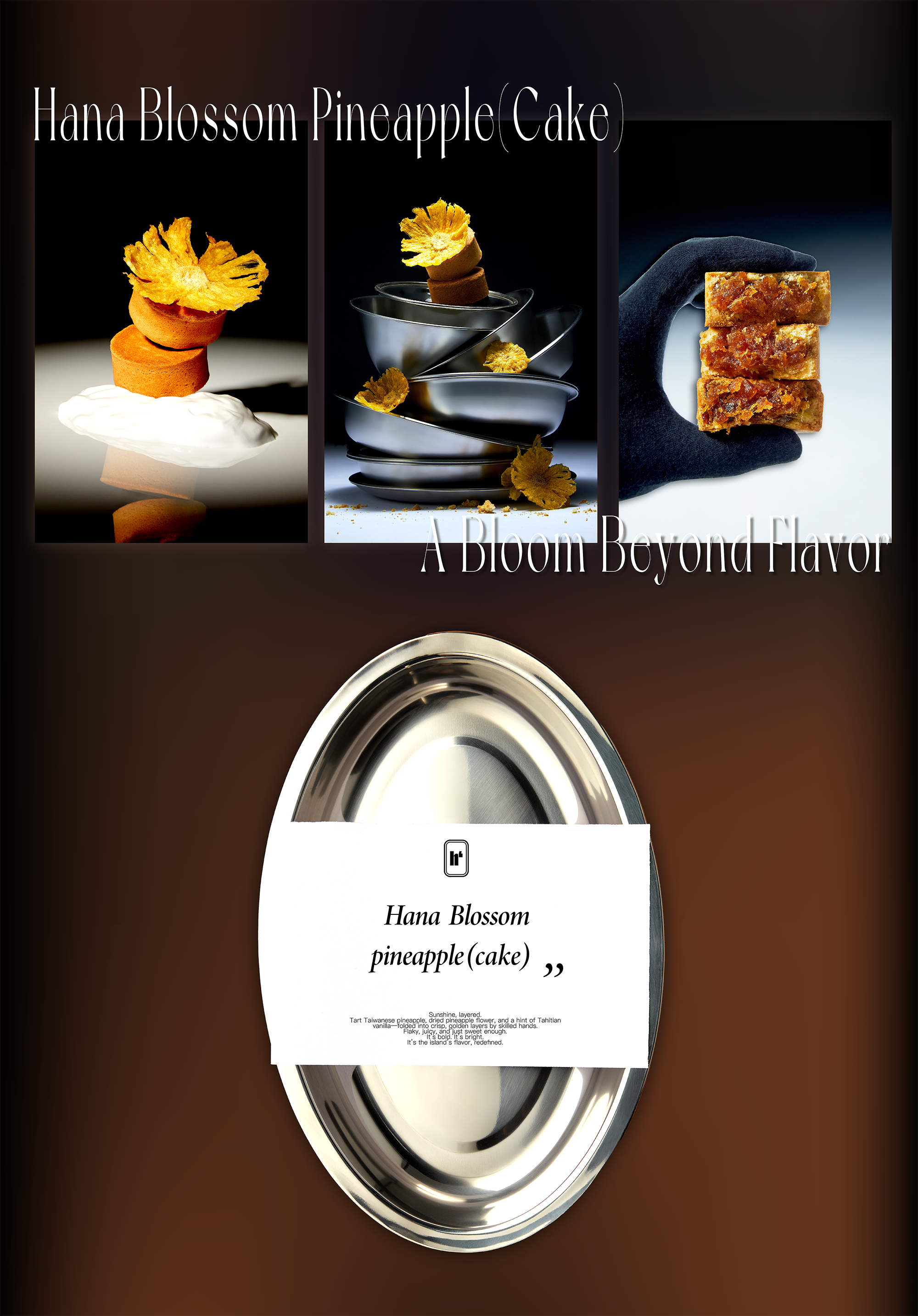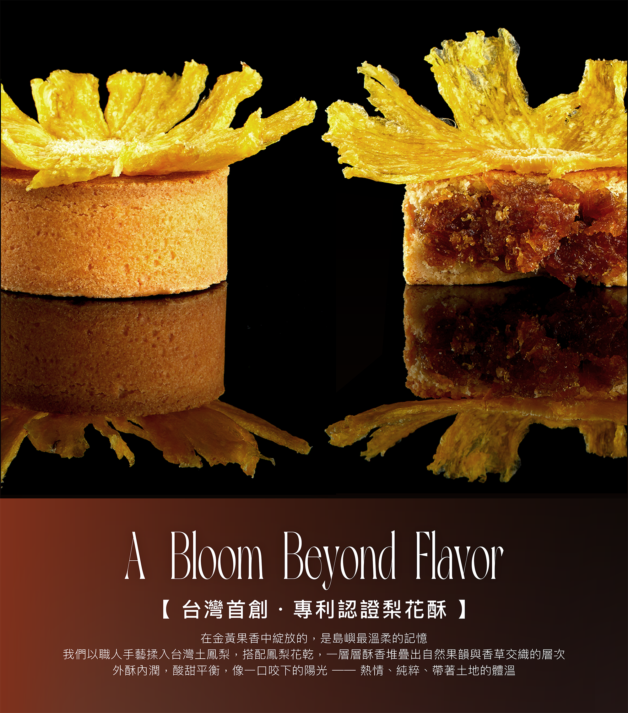 以職人手藝揉入台灣土鳳梨,搭配鳳梨花乾,酸甜馥郁、果香明亮,品嚐島嶼熱帶風土的優雅綻放