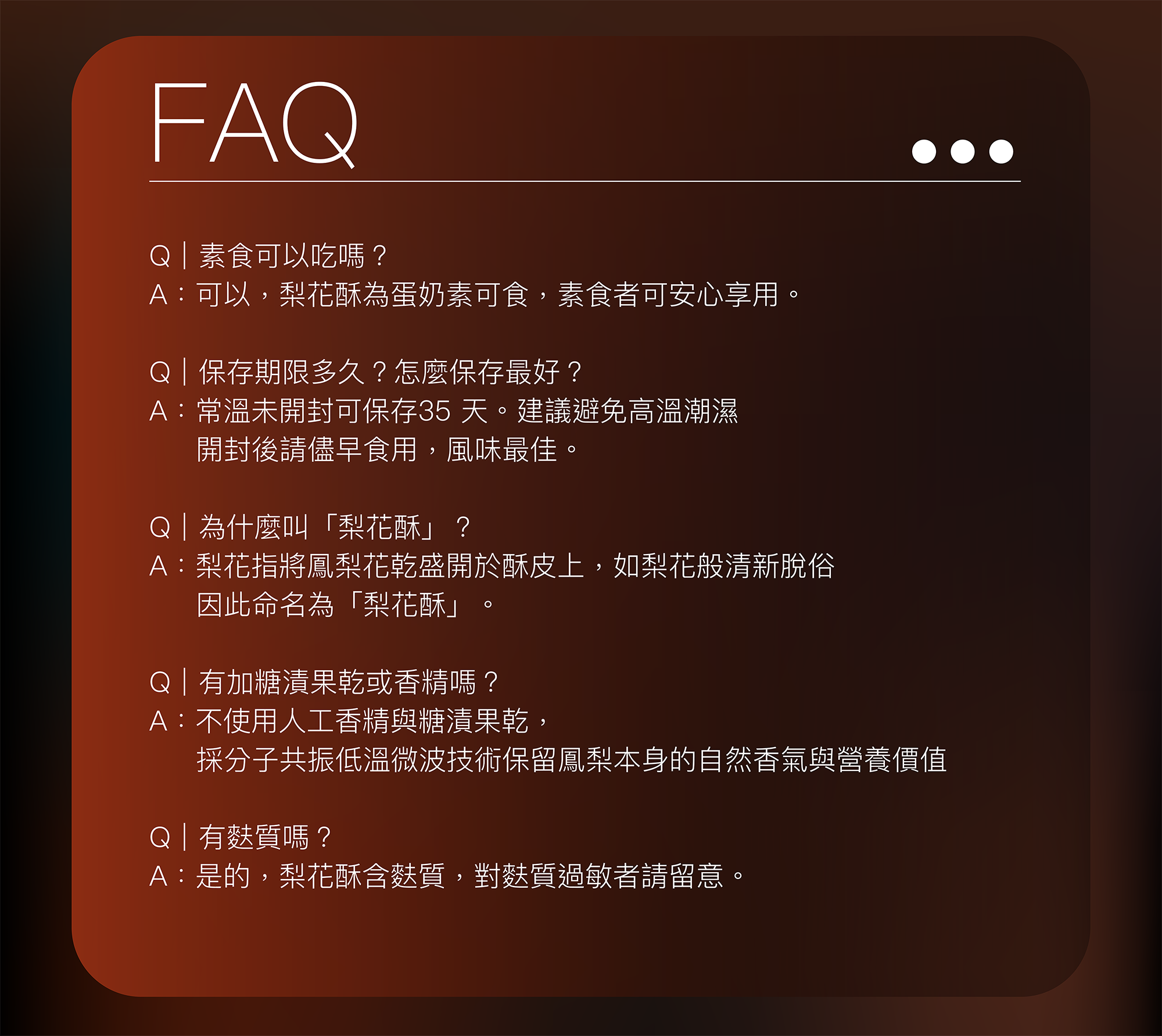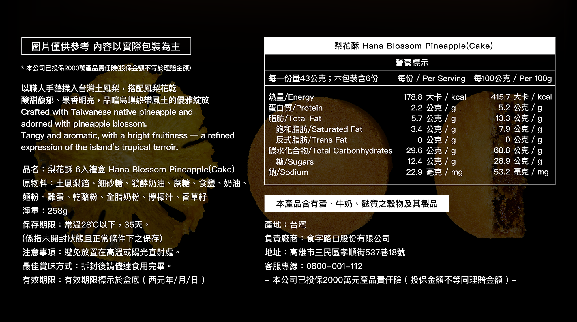 原物料 | 土鳳梨餡、砂糖、發酵奶油、蔗糖、鹽、奶油、麵粉、雞蛋、乾酪粉、奶粉、檸檬汁、香草籽